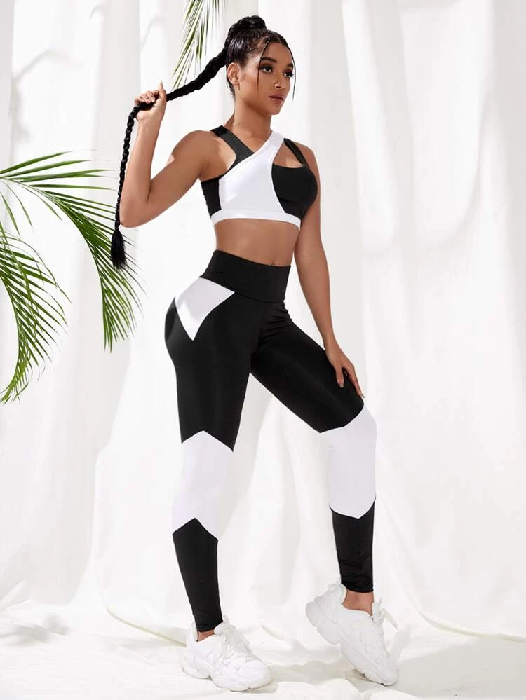 Yoga Set with Crisscross Bra and Wide Waistband Leggings in Two Tones.