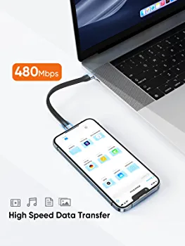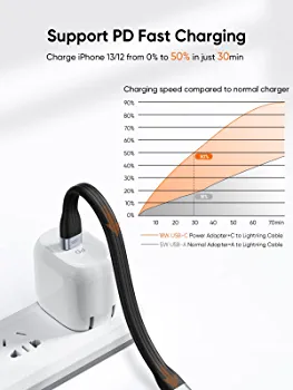 This CableCreation product is a 0.5ft USB Type C to Lightning cable that is Apple MFi certified, ensuring safe charging and full compatibility with the iOS system. The cable supports PD fast charging when used with a USB-C PD charger, and offers data transfer speeds of up to 480Mbps. The cable is made with premium materials, including an aluminum shell and TPE jacket, and has a lifespan of over 10,000 bends. It is compatible with iPhone 8 and later models for fast charging, and comes with an original C94 connector. The cable is available in various lengths and types, including a 6-inch short cord. Please note that fast charging requires a USB-C PD adapter and that charging speeds may slow down after 75% battery.