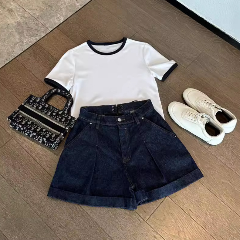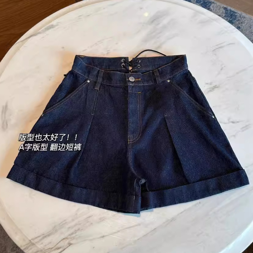 041605 Summer New Women's Wide Legs High Waist Slimming Korean Stretch Casual Dark Blue Stylist Denim Shorts