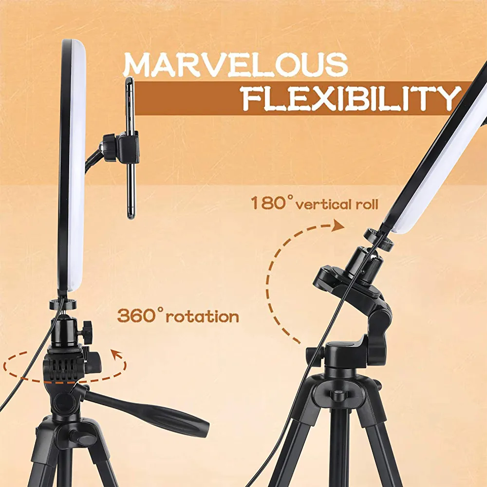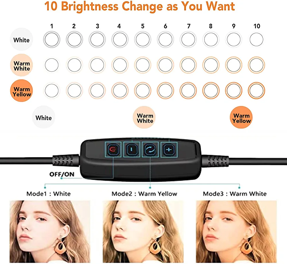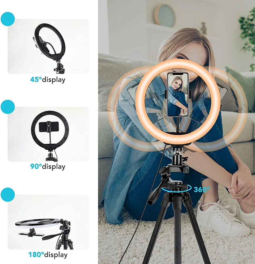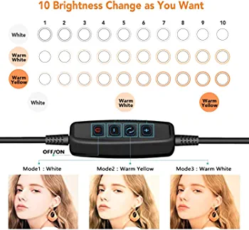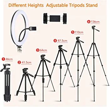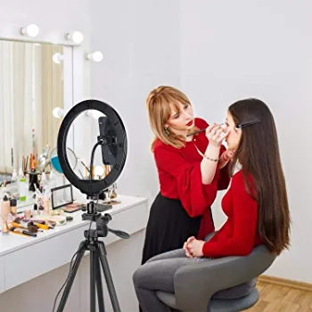 Introducing the Eocean 26 cm LED Ring Light with Tripod Stand and Phone Holder. This product offers three different lighting modes and ten levels of brightness to enhance your makeup application, live streaming, and video recording. The ring light provides ample lighting to brighten your skin and make you look younger, while also improving the clarity of your videos and photos. The rotatable ring light platform allows you to easily adjust the angle of the light to suit your needs, making it perfect for photography and live streaming.