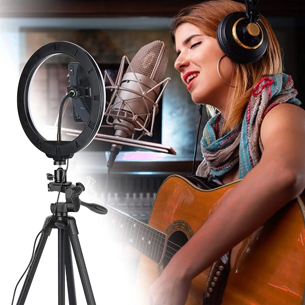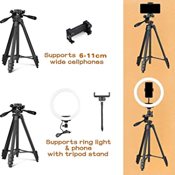 The package includes a ring light with a gooseneck phone holder, a tripod stand, a Bluetooth remote control, a tripod mount phone holder, and a carrying bag. Upgrade your photography and video recording game with the Eocean 26 cm LED Ring Light with Tripod Stand and Phone Holder.