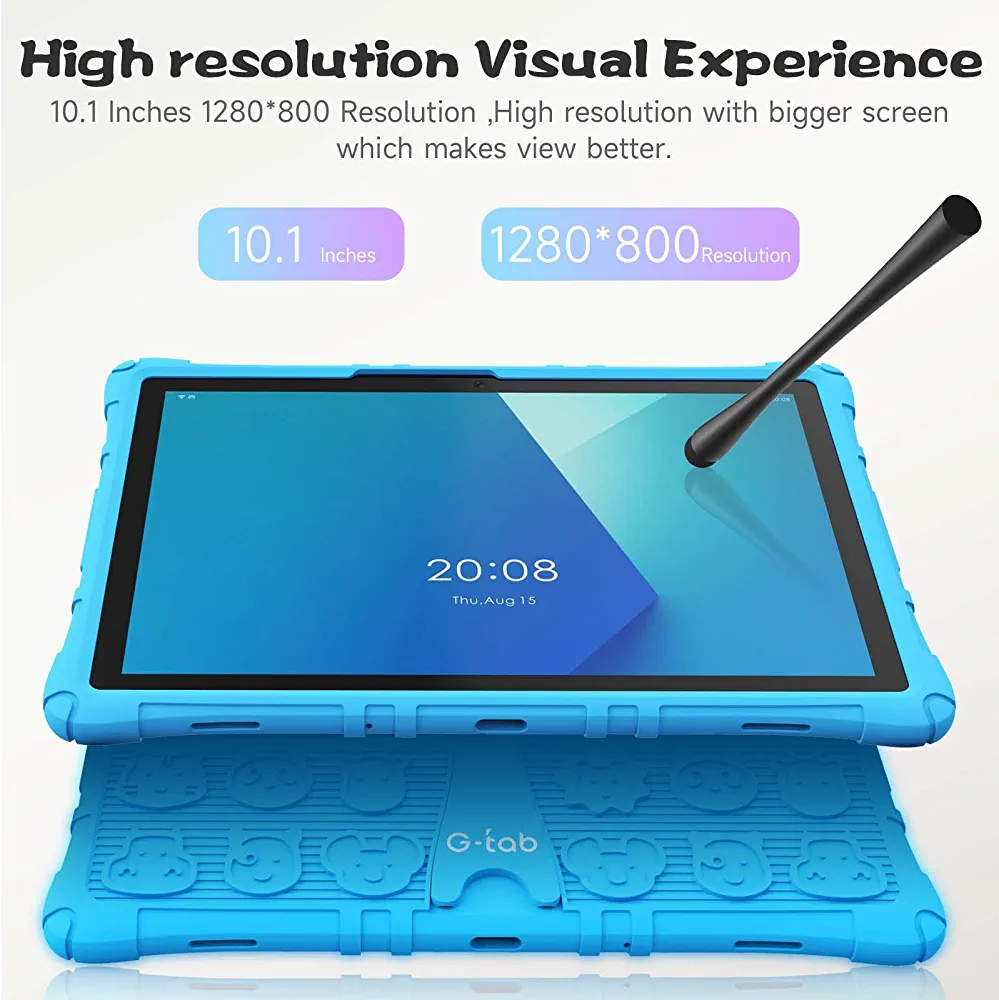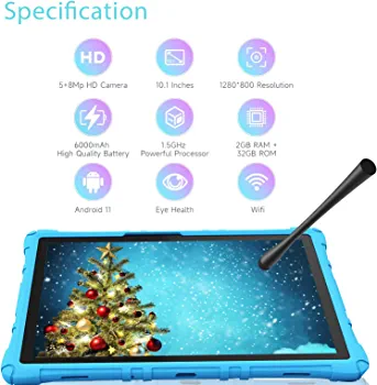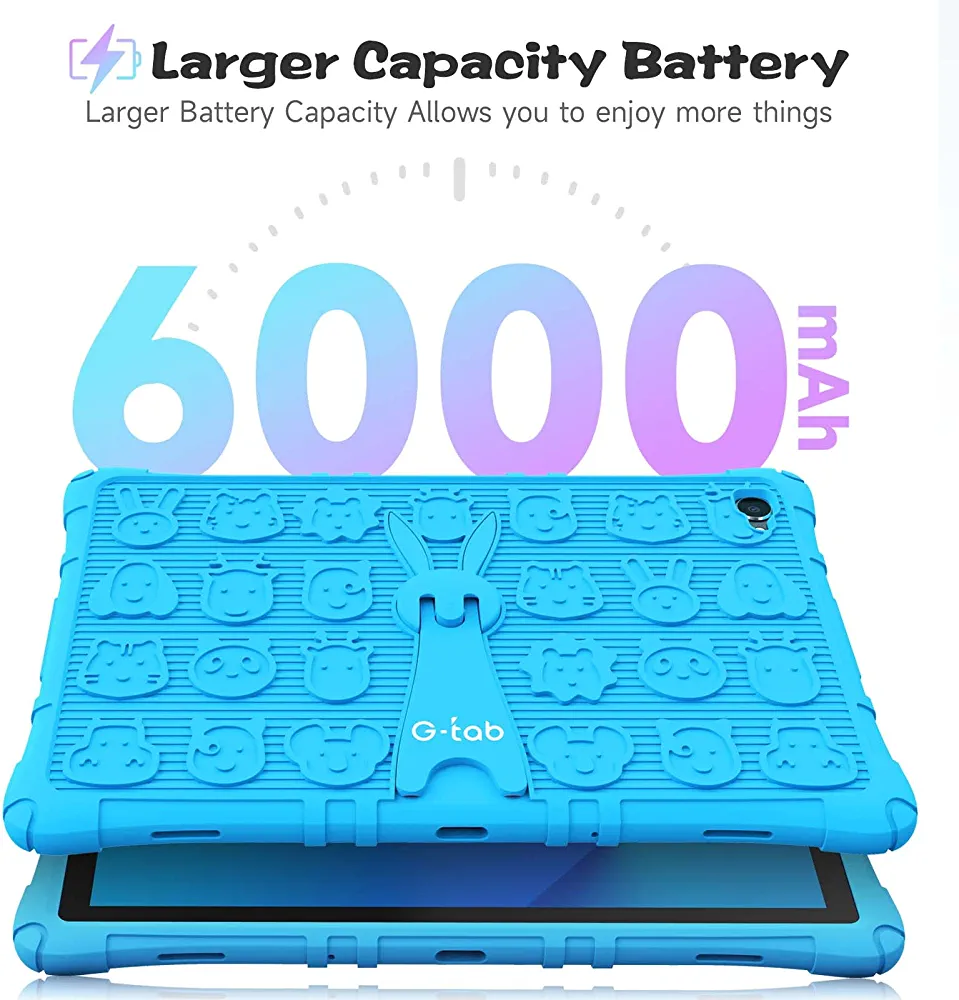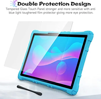 10″ Android 11 Kids Tablet with 32GB storage, dual camera, and parental control in a kid-proof case. Ideal for educational games and suitable for toddlers. Available in blue.