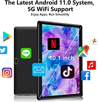 10″ Android 11 Tablet with Quad-core Processor, Keyboard, 64GB ROM + 4GB RAM, 128GB Expandable, 5G WiFi, Bluetooth, GPS, and HD Display.