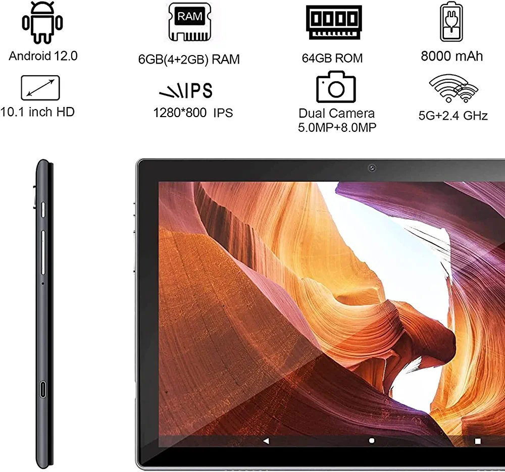 Android Tablet 10 inch, Android 12 Tablet, 6GB RAM 64GB ROM, 512GB Expand Android Tablet with Dual Camera, 5G & 2.4G WiFi, Bluetooth, 8000mAh, HD Touch Screen, Google GMS Certified
