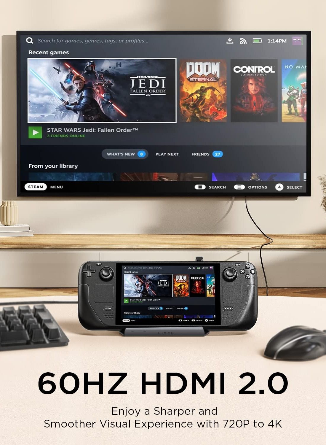 The 4K@60Hz HDMI 2.0 output provides a sharper and smoother visual experience when you connect an external 4K monitor. Additionally, the docking station supports 100W max power delivery, which is sufficient to charge your Steam Deck at full speed when paired with the original charger.