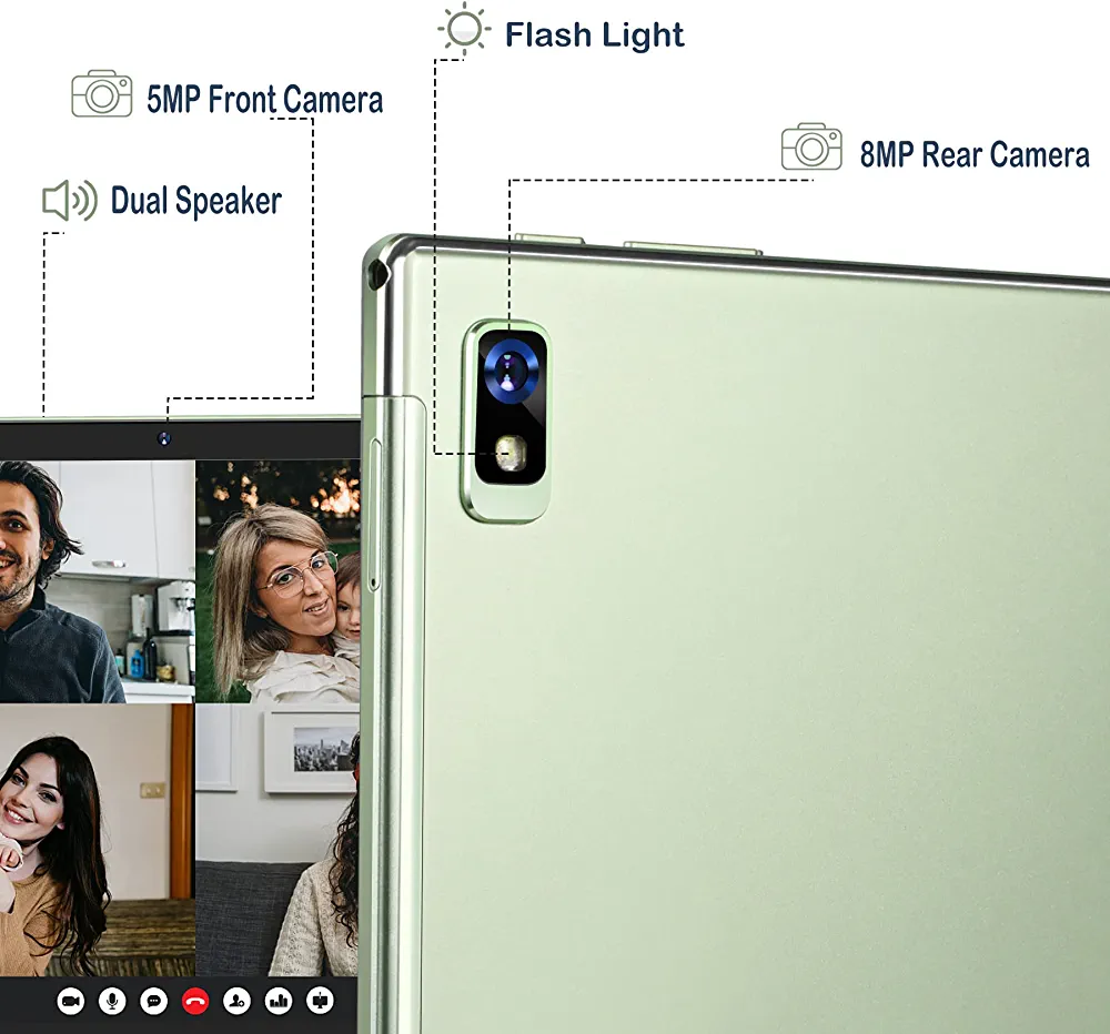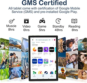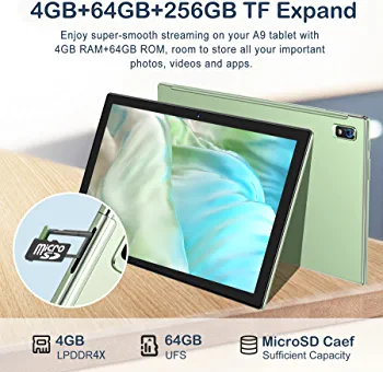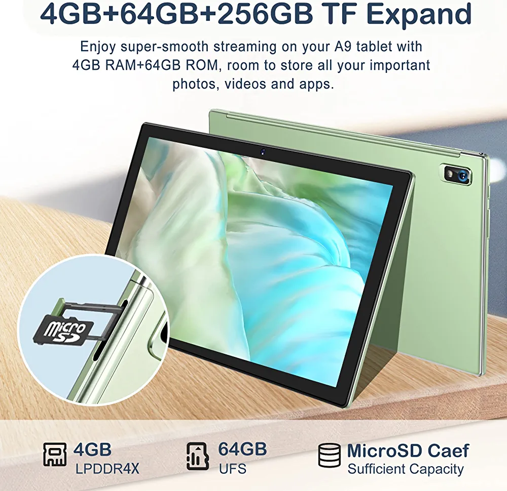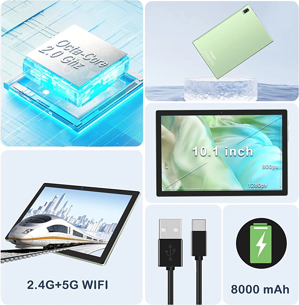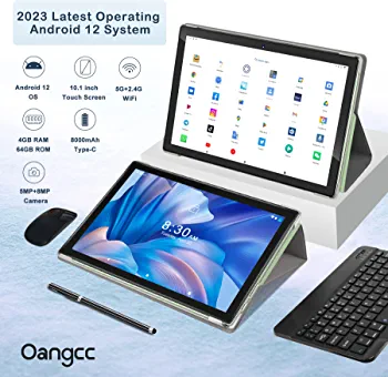 Introducing the Oangcc A9 tablet, equipped with the latest Android 12 operating system and an MTK8183 Octa-Core CPU running at 2.0GHz. With 4GB RAM and 64GB ROM, this tablet provides ample storage space for your apps, files, and media. The 10.1-inch IPS screen with a resolution of 1280×800 pixels supports 1280p video playback, making it perfect for streaming your favorite shows and movies. The tablet also features dual cameras, with a 5MP front camera and an 8MP rear camera.