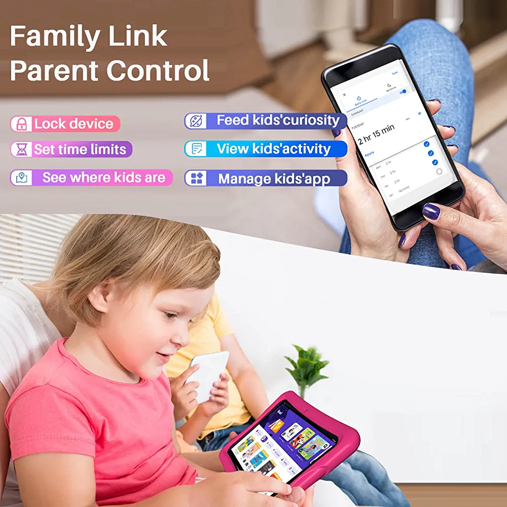 This tablet is designed specifically for kids, with a protective case made of soft silicone material that is lightweight, durable, and impact-resistant. The case also features a built-in stand that can be adjusted 360 degrees to support the tablet from any angle. Parents can easily control the content their child accesses with Google’s Family Link parental controls, which limit screen time and provide access to educational content such as videos, games, and learning materials. The tablet’s 10-inch IPS HD display provides a full-angle viewing experience and is designed with low blue light technology to protect kids’ eyes. With 32GB of internal storage and up to 20 hours of battery life, this tablet is perfect for on-the-go entertainment. Plus, it comes with a 2-year worry-free guarantee and excellent customer service.