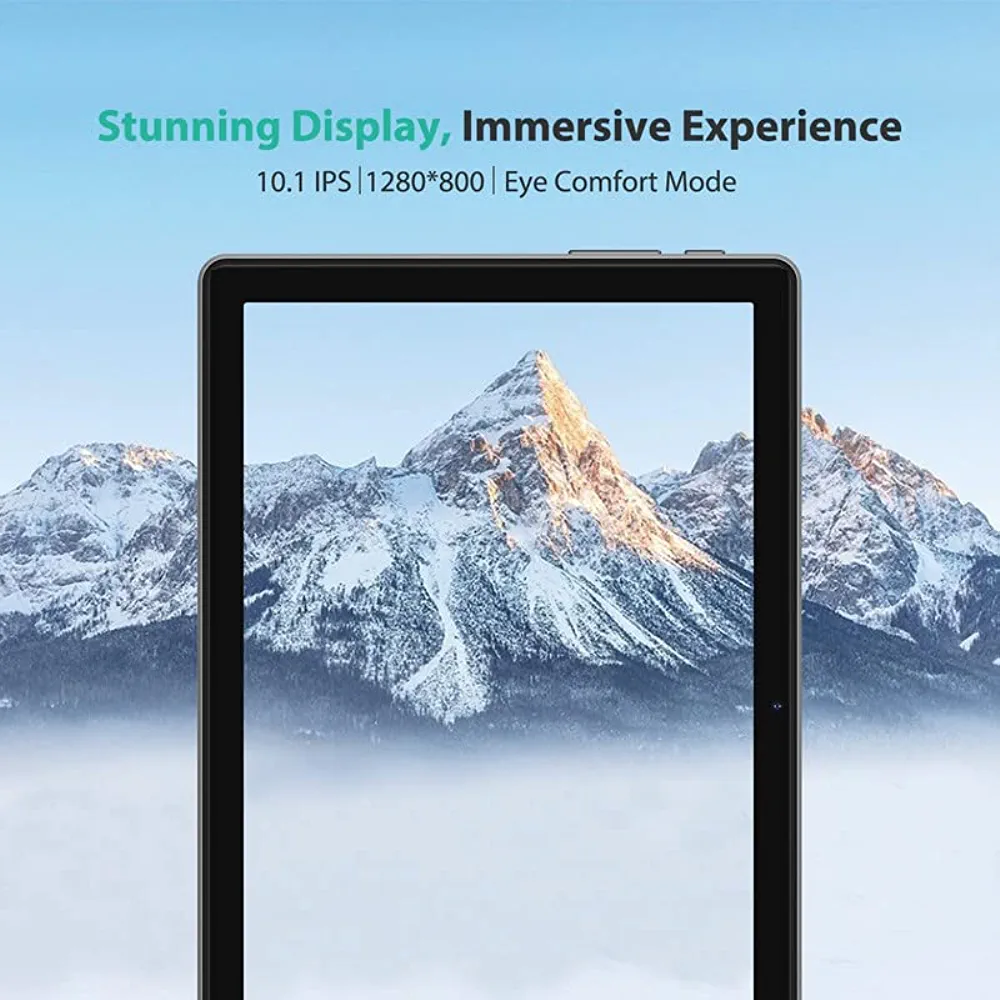 A Great Helper for Entertainment and Work — With a 1280 x 800 resolution full screen, 10 inch IPS Display, wide viewing angle, 2MP front camera, and 5MP rear dual camera, this tablet is perfect for entertainment and work. The dual-speaker and 3.5mm headphone jack ensure stunning sound quality. You can even project it on TV for a larger screen experience or turn on the eye-protection mode for reading. This tablet makes a great gift for Valentine’s Day, Anniversary, kids Birthday, Festivals, Mother’s Day, Christmas, and Father’s Day.