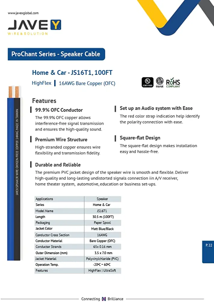 | nameOriginal | JAVEX 16-Gauge AWG Speaker Wire OFC Oxygen-Free Copper HighFlex Cable for Hi-Fi Systems, Home Theater and Car Audio System, 100 FT, Blue/Black |