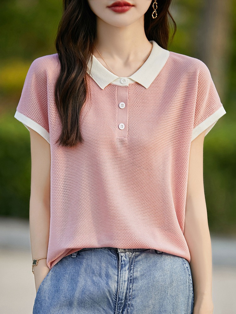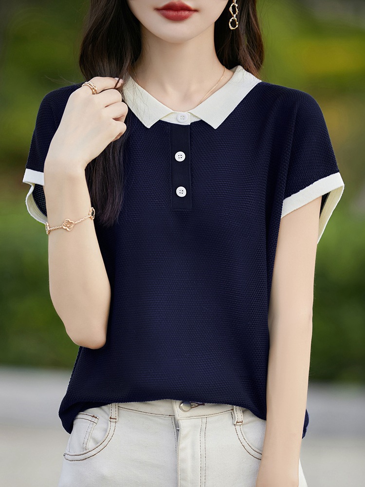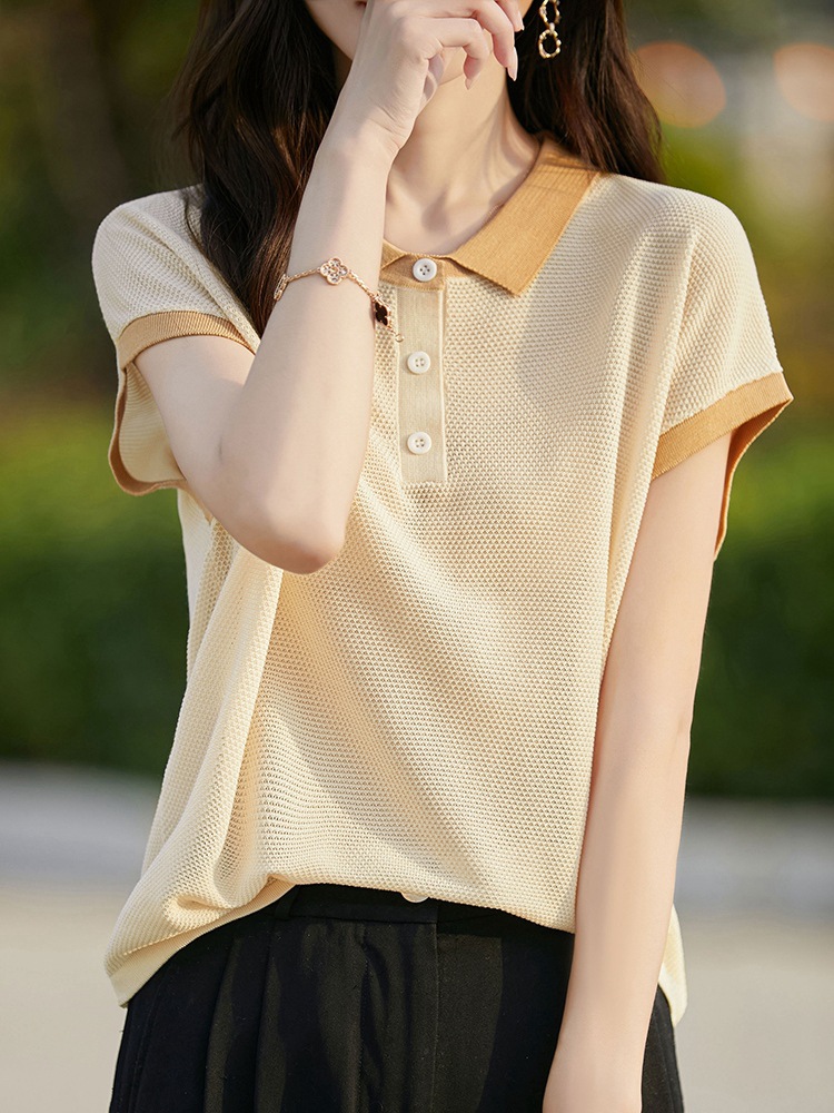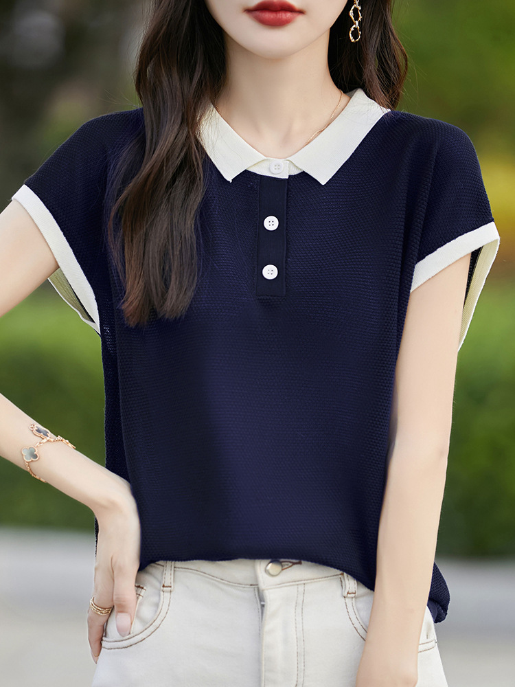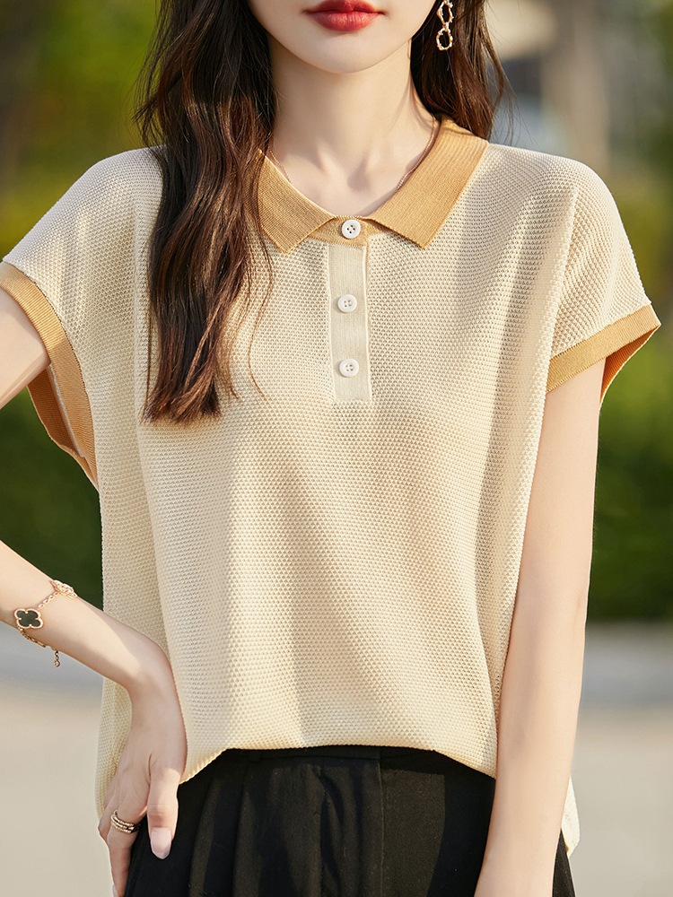 100 Lyocell Tencel Color Contrast Doll Collar Flying Sleeve Short-sleeved T-shirt Women’s Summer Thin Slimming Base Shirt