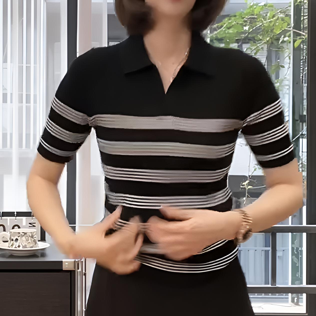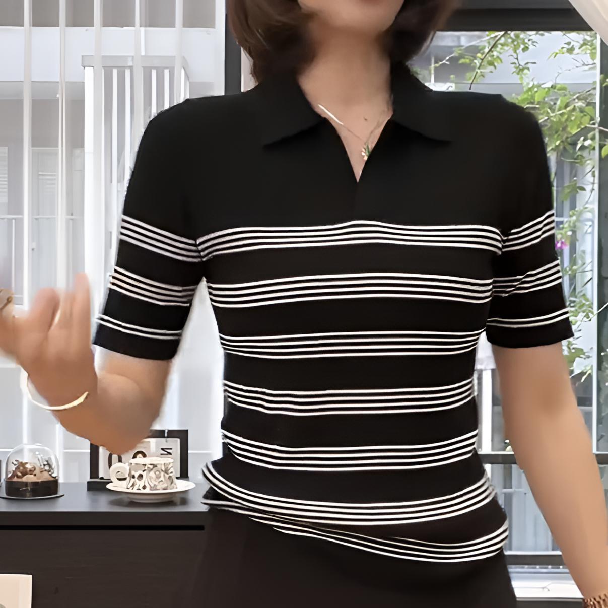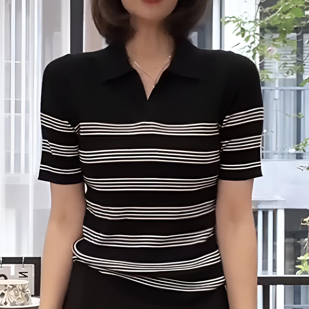[100 Lyocell Tencel] New Striped Short-sleeved Women’s Summer Slim-fit Slimming Age-reducing POIO Collar Fashion Knitted