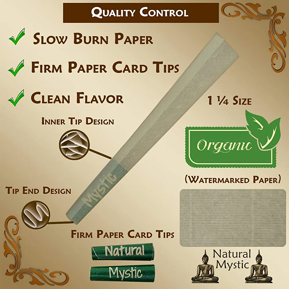 This product offers convenience and saves time by allowing you to easily roll or fill a sleek and seamless preroll in just a few minutes. It guarantees a perfectly rolled cone with very little wastage, making it ideal for both newbies and experts. The Natural Mystic blend of organic raw fibers ensures a slow, even burn and prevents runs on your papers. The cones also feature strong multi-cut inner filters that withstand moisture and provide a smooth smoke flow. The brand ensures authenticity and genuine quality in every purchase, with strict quality controls and no counterfeits. The cones come in durable and environmentally friendly packaging, neatly stacked in a hard paper box with an innovative slide-out cone holder for easy dispensing. They are perfect for sharing with friends, traveling, road trips, and easy storage in carry-on luggage at airports. With every purchase, you get value for your money and consistent quality for each cone.