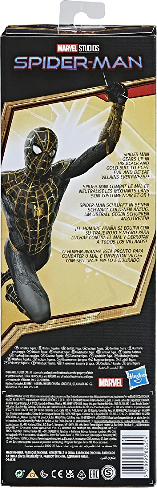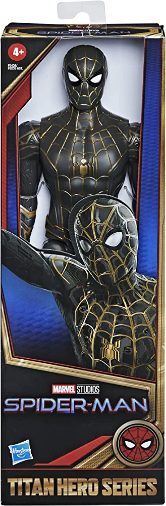 Introducing the Marvel Spider-Man Titan Hero Series: Black & Gold Suit Spider-Man, the perfect toy for kids who love to imagine themselves as their favorite superhero. This action figure is inspired by the Spider-Man movie and is designed to bring the web-slinging, wall-crawling action to life. With the black and gold suit, Spider-Man is ready to take on any challenge and defeat villains wherever they may be. This figure is part of the Marvel Cinematic Universe and is perfect for kids who want to create their own epic adventures. Get ready to swing into excitement with Spider-Man!