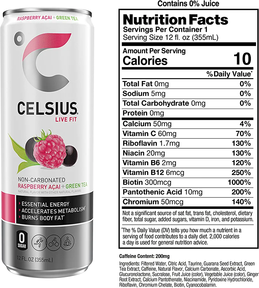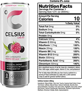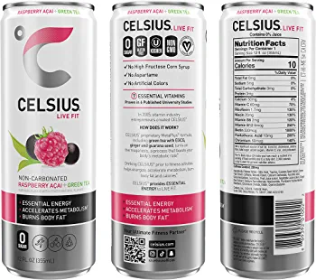 | descriptionOriginal | Description CELSIUS is functional, Essential Energy, a better-for-you, premium alternative to traditional energy drinks. As a global, lifestyle fitness drink, CELSIUS was created to help people LIVE FIT, exceed their goals and elevate their everyday lives. Made with proven, premium ingredients, 7 Essential Vitamins and zero sugar, no artificial colors, no aspartame, no high fructose corn syrup and non-GMO. CELSIUS is vegan, gluten-free and Kosher. Our proprietary MetaPlus blend contains green tea extract with EGCG. It also includes guarana seed extract, ginger root for flavor and digestion, vitamin C to help support your immune system, vitamin B for energy production, and chromium to help control hunger, making it an ideal pre-workout drink. Enjoy the non-carbonated uplifting combination of sweet raspberries and tart, refreshing acai. Our non-bubbly Raspberry Acai Green Tea CELSIUS Flavor will keep you moving! Made with clinically proven ingredients, this carbonated flavor of CELSIUS has the perfect balance of flavor and energy that serves as an awesome pick-me-up for active lifestyles. Make CELSIUS your go-to choice for Essential Energy! CELSIUS is available in 12 oz. slim cans and sold in a 12-pack for convenience. |