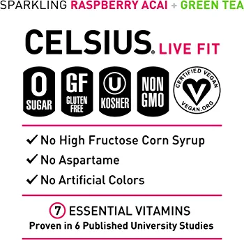 The CELSIUS drink is a premium, better-for-you alternative to traditional energy drinks that helps people live fit and exceed their goals. It contains 7 essential vitamins, zero sugar, no artificial colors, no aspartame, no high fructose corn syrup, and is non-GMO, vegan, gluten-free, and Kosher. The proprietary MetaPlus blend includes green tea extract with EGCG, guarana seed extract, ginger root, vitamin C, vitamin B, and chromium, making it an ideal pre-workout drink that helps control hunger. The Raspberry Acai Green Tea flavor is non-carbonated and has a perfect balance of flavor and energy, making it an awesome pick-me-up for active lifestyles. CELSIUS is available in 12 oz. slim cans and sold in a 12-pack for convenience.