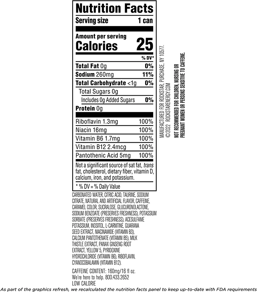 | descriptionOriginal | Description Put in the work with Rockstar original sugar free energy drink, fully-charged with B-vitamins and formulated with guarana, taurine, and caffeine to help keep you going and stay focused* with invigorating taste. *>75mg caffeine has been shown to help improve attention. |