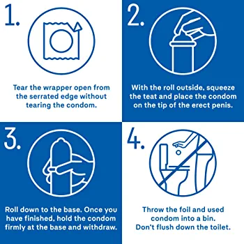 Durex condoms are rigorously tested against breakage and are made with fine quality raw materials. They fit well and do not cause any loss of sensitivity during sex. After use, hold the condom at the base as you pull out, knot it, and dispose of it.