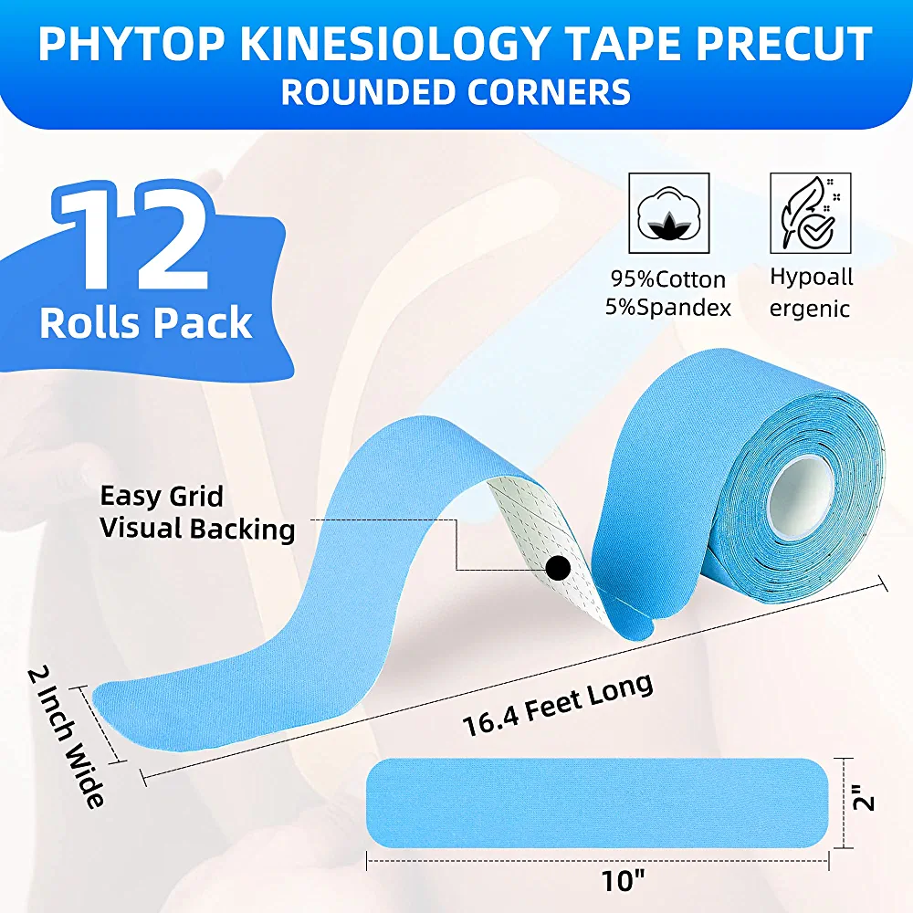 12-pack PHYTOP K Tape for athletes, pre-cut 10″ strips of premium kinesiology tape for knees, shoulders, ankles, and elbows. Latex-free and breathable with mixed colors.