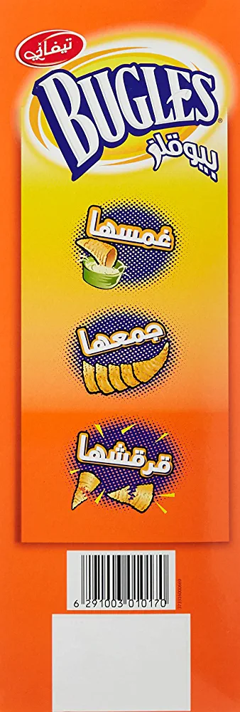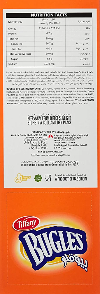 | descriptionOriginal | Tiffany Bugles – Cheese A unique funnel shaped snack that delivers a crispy cornmeal crunch, which will leave you reaching for more. |