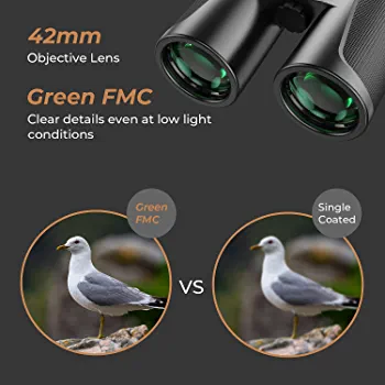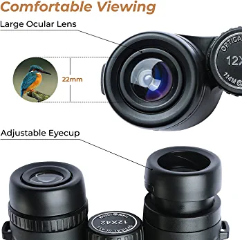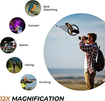 | descriptionOriginal | Suitable for Various Events 1 * Binocular 2* Ocular Lens Cover 2 * Objective Lens Cover 1 * Phone Adapter 1 * Tripod-ready Clip 1 * Neck Strap 1 * Cleaning Cloth 1 * Carrying Bag 1 * User Manual with muson 12X42 HD Binoculars With BAK4 prism and green FMC optical coating, these 12X42 HD binoculars offer crisp and sharp images, suitable for various events, like bird watching/ concert/ sports/ hiking/ hunting/ stargazing. These solid build binoculars are also easy to focus and comfortable to view, making them perfect gifts for adults and teens to meet their curiosity and explore the world. 12x magnification With advanced BAK4 prism and green fully multi-coated optical coating, our HD roof prism binoculars provide sharp and bright view and preserve the true color of observed objects. See every detail of your target clearly with our powerful binoculars: 12x magnification, 42mm objective lenses and wide field of view (374ft/1000yds). Our sturdy binoculars feature rubber armor and anti-slip design for comfortable grip and durable protection. They also come with a neck strap and bag for carrying around. Adjust Eyecups Enjoy comfortable viewing with or without eyeglasses! For better viewing experience, please twist eyecups down when wearing eyeglasses. Twist eyecups up if you don't use eyeglasses. Adjust IPD Match the interpupillary distance (IPD) of your eyes and the binocular. Please rotate the barrels in or out until you can get a single circular view. Focus Binoculars * Make sure to open the caps of the ocular lens and objective lens. Step 1: Close your right eye or cover the right objective lens. Look at an object about 20 yards away with your left eye and adjust the center focus knob until the image is clear. Step 2: Close your left eye or cover the left objective lens and rotate the diopter ring until the image is sharp and clear. How to Attach the Neck Strap? Push the strap through the strap attachment on the binocular. * In Step 1, you can also push the strap through the strap attachment on one of the ocular lens caps to avoid losing them. |