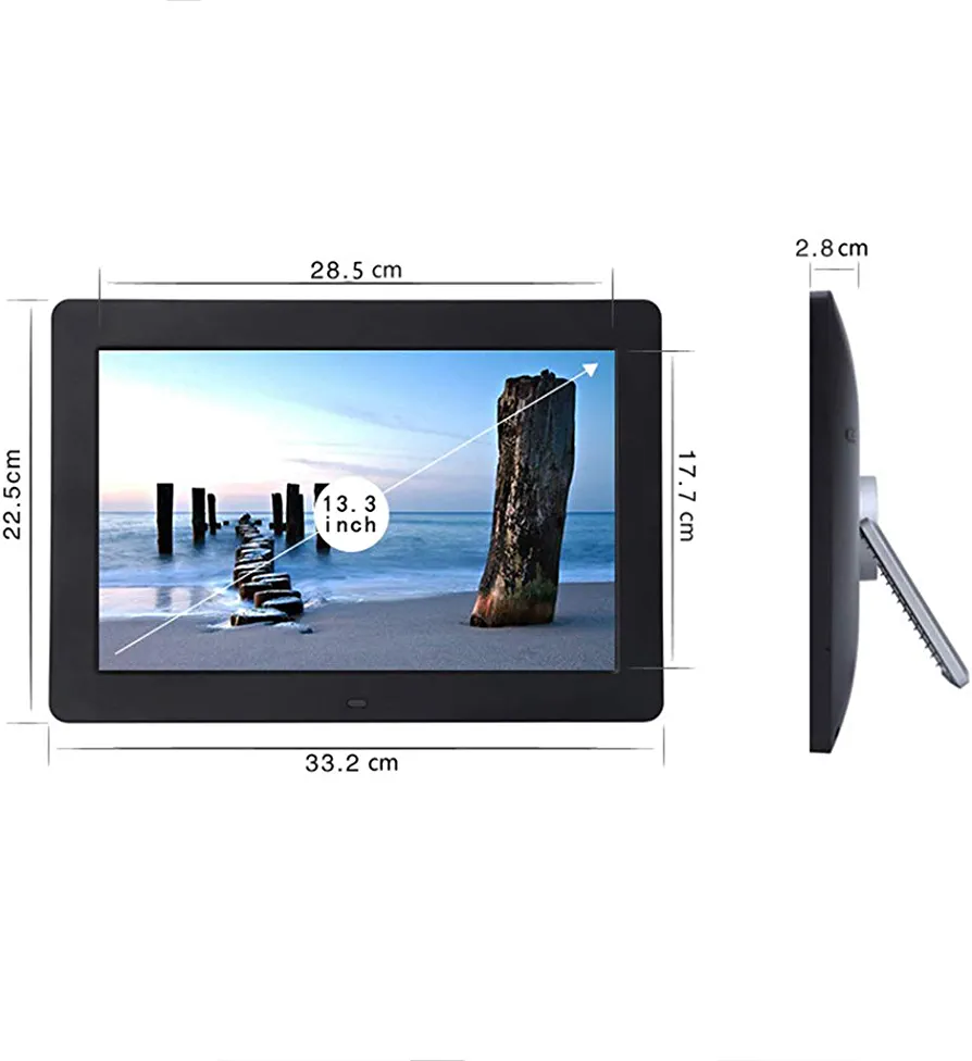 This product features a 13.3 inch LED screen with a resolution of 1280×800 and a brightness of 350 cdm2. The contrast ratio is 1000:1 and the display ratio is 16:10 with a display area of 285 × 177mm. It is equipped with an A33 quad-core processor clocked at 1.4G, 1GB memory, and 8GB flash. The operating system is Android 4.4.2 and it supports WIFI, Ethernet, and Bluetooth 4.0 connectivity. It also supports external 3G/4G USB dongles for internet access.