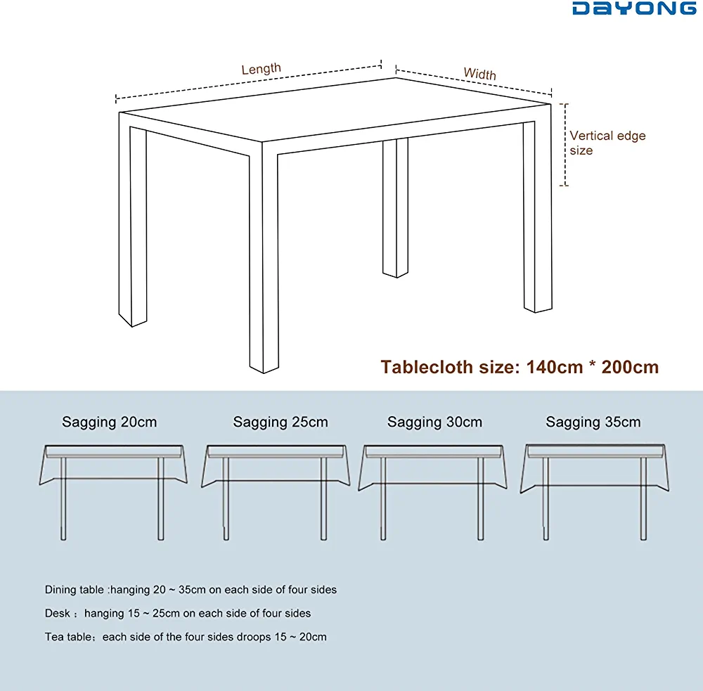 The tablecloth measures 140*200cm (55*78.7inch) and fits table sizes ranging from 30”-40” to 55”-63”. To ensure the perfect fit, use our simple formula to calculate the length and width of the tablecloth based on your table size and desired droop length.