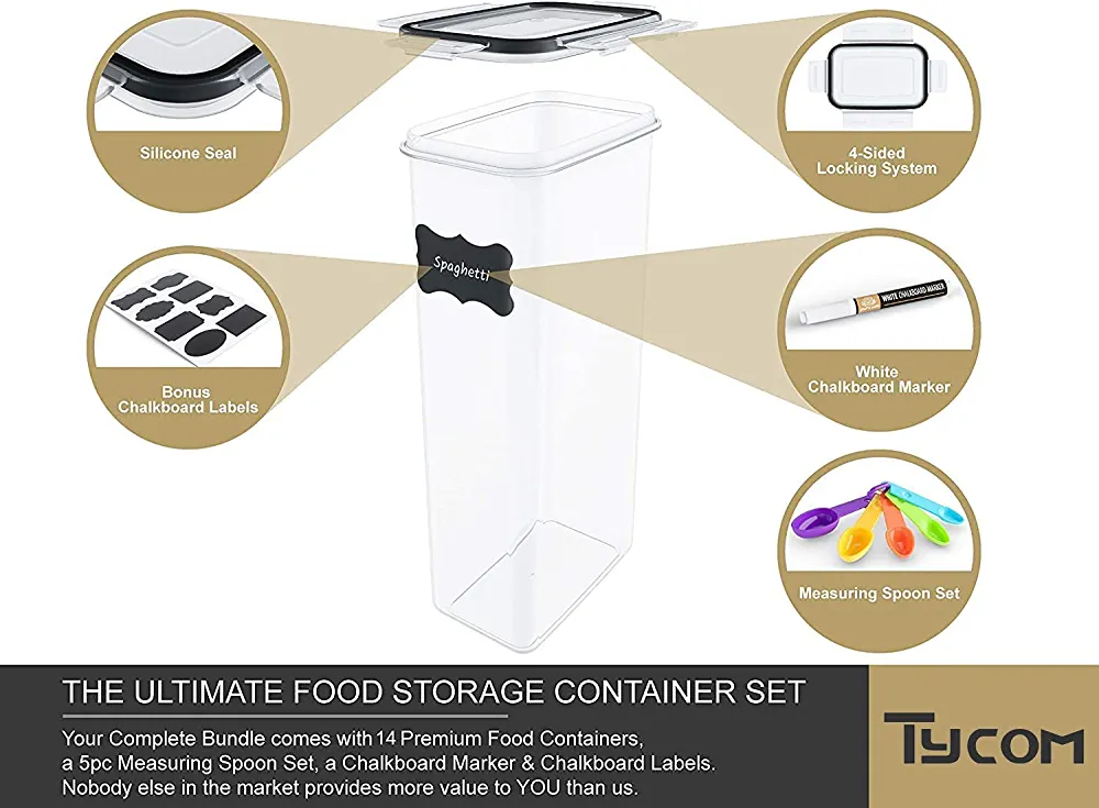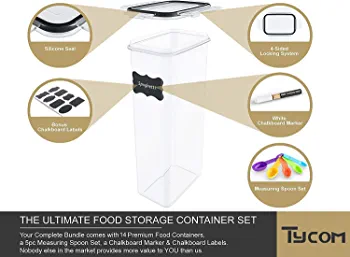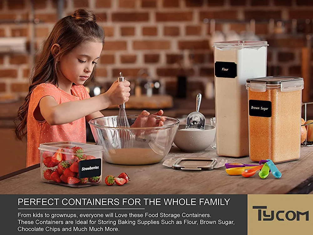 All of Tycom’s bulk food storage containers are made with high-end, BPA-free plastic that is both safe and durable, making them the perfect choice for flour and sugar containers or snack containers. Choose from a variety of options, including 14Pcs, 7Pcs, Easy Lock-7Pcs, Easy Lock-4Pcs, and Rice Storage Bin 4 Pcs, all of which are airtight and BPA-free.