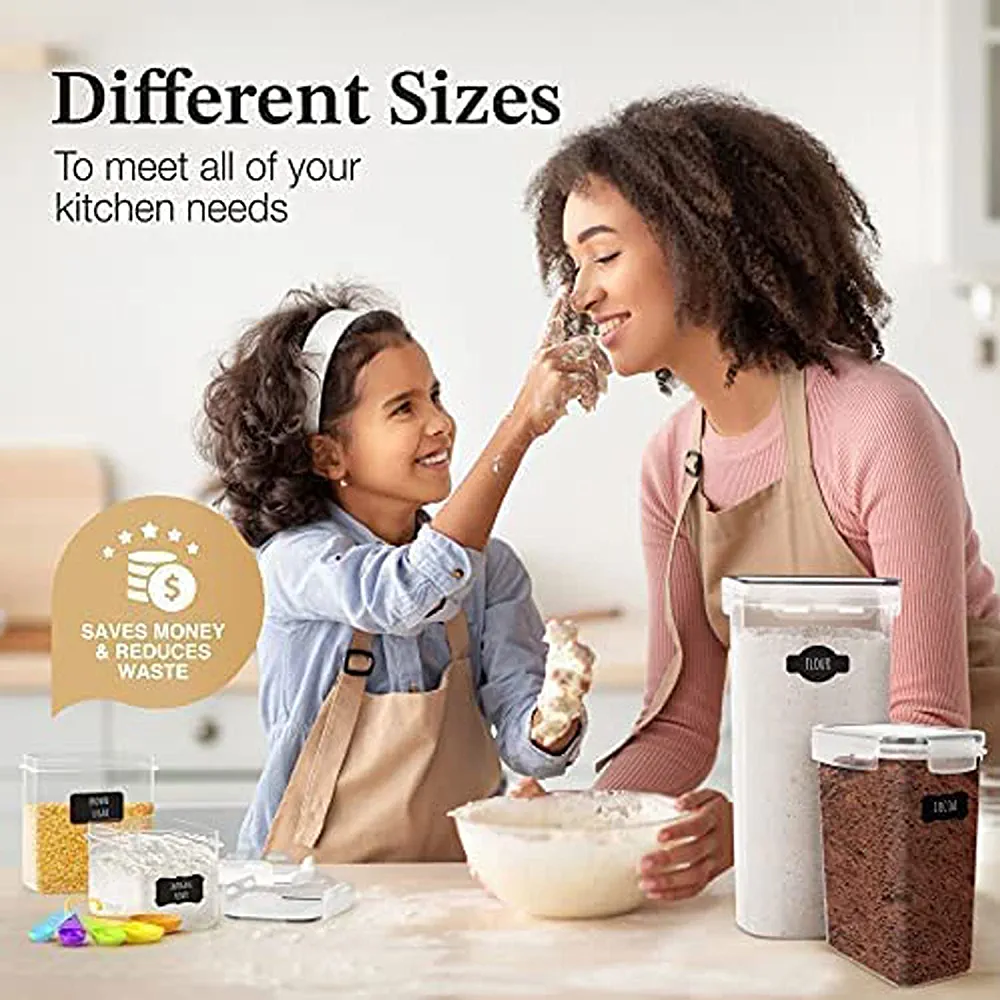 Say goodbye to messy cabinets and kitchen counters with these stackable containers that save you time and space in the kitchen. The set comes with a chalkboard marker, labels, and measuring spoon set, providing you with everything you need to keep your pantry organized.
