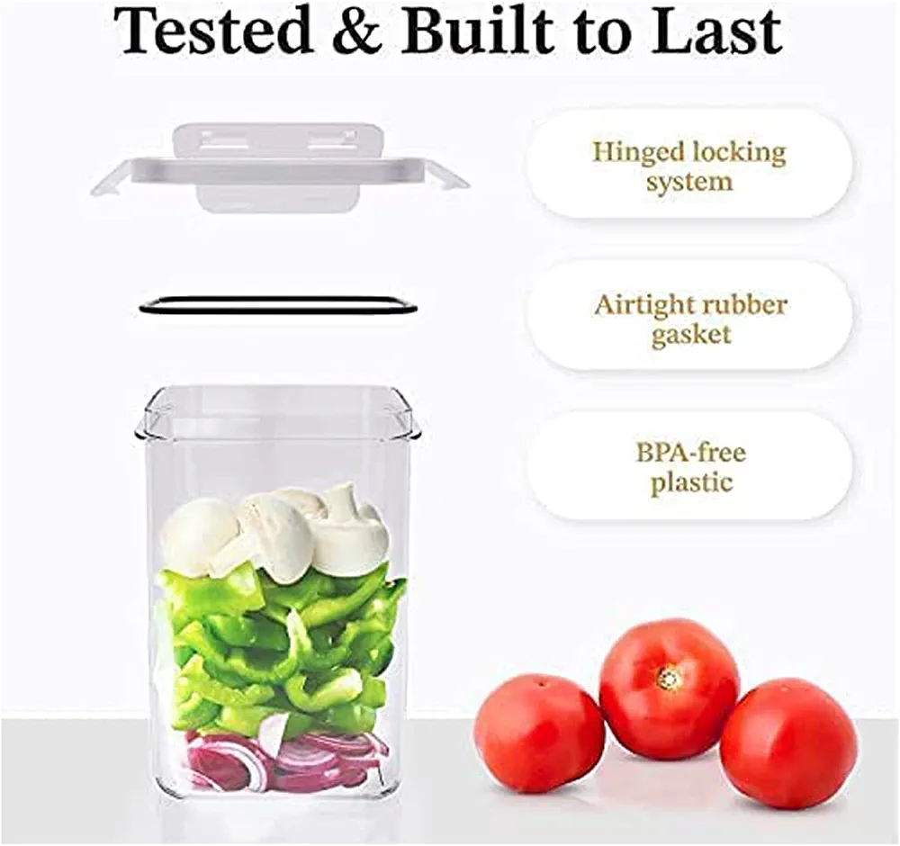 These Airtight Seal Lids feature 4 side-locking lids with black silicone gaskets that keep your food fresh and tasty while in storage. The modular shape of these pantry storage containers makes it easy to stack and store them, keeping your pantry organized. The see-through, durable plastic containers allow you to easily see what’s inside, and they are BPA-free for safe long-term storage.