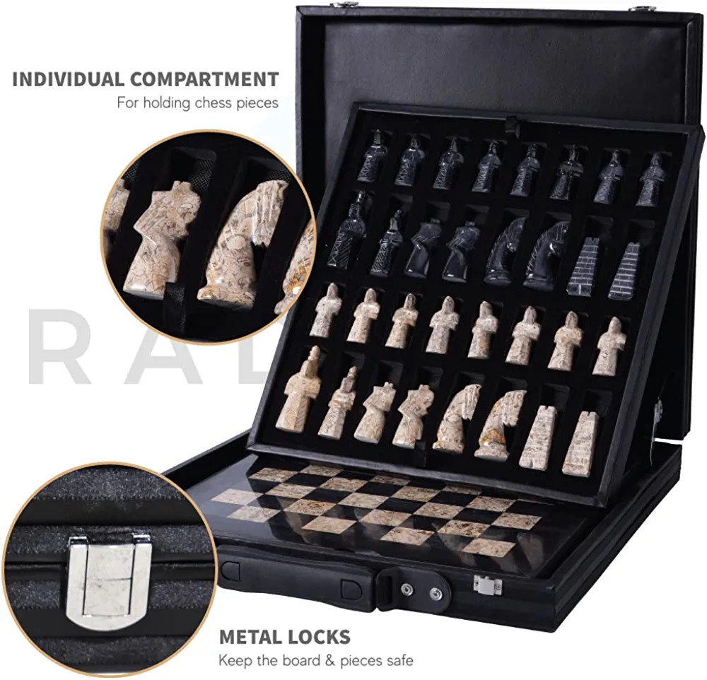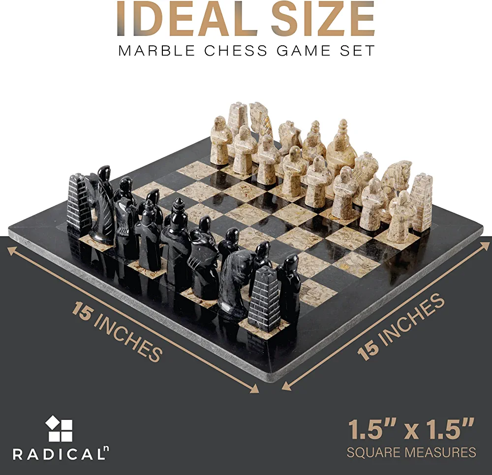 The RADICALn 15 Inches Large Handmade Original Marble Black and Coral Full Chess Game Set is the perfect addition to any chess enthusiast’s collection. This tournament chess set features a stunning black and coral marble board that is both durable and visually striking. The set includes two players Staunton table chess pieces that are intricately crafted and designed for a comfortable grip during gameplay. The large size of the board and pieces make it easy to play for adults, and the handmade craftsmanship ensures that each set is unique. Whether you’re a seasoned chess player or just starting out, this full chess game set is sure to provide hours of entertainment and challenge.