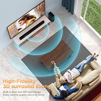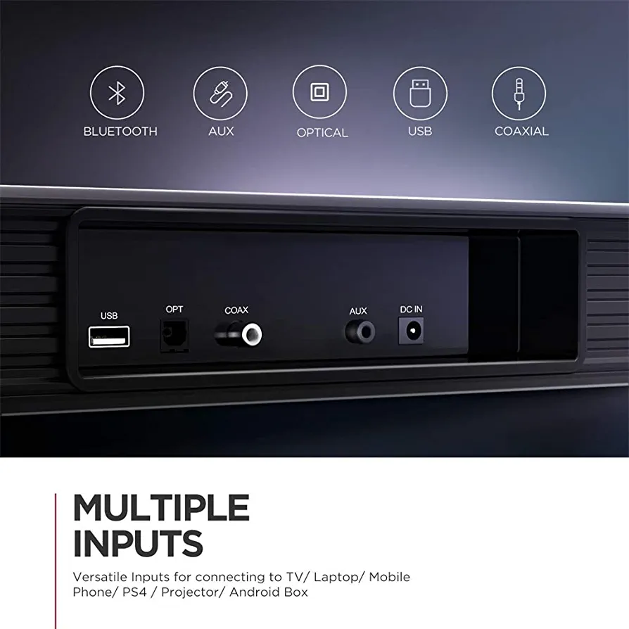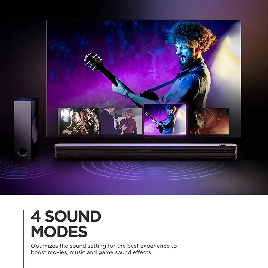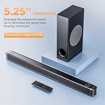Experience powerful sound with a peak power of 150W and a sound level pressure of 120dB. Say goodbye to tangled cables with the wireless connection between the subwoofer and sound bar. The 5.0 system features two transmission options for quick connectivity. Enjoy clear and rich sound with five full-range drivers and two deep bass reflex tubes. Connect to various devices with optical, AUX, USB, and coaxial inputs. The sound bar also includes a display screen and AIRPLAY feature with a total harmonic distortion of 0.5%. The package includes one sound bar. If you have any inquiries, please contact us and we will respond within 24 hours. Perfect for Bluetooth desktop computer speakers, gaming with stereo speakers, and wireless home entertainment.
