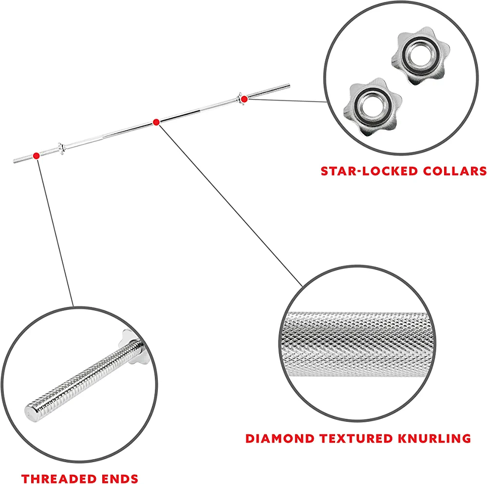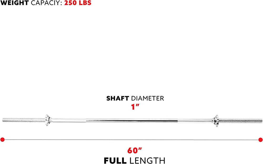 FULL BODY WORKOUT Perform a total body workout at the convenience of your own home. Workouts such as back squats, front squats, overhead squats, zercher squats, deadlifts, rack-pulls, stiff-leg deadlifts, sumo-stance deadlifts, bent-over rows, bench presses, overhead presses, cleans, jerks, snatches, power cleans, push presses, and power snatches will provide fast and effective results! 113 KG CAPACITY Threaded chromed sleeve bar holds weights up to 113 kg. Accommodates weight plates with 2.5 cm center holes. Ergonomic design keeps storage easy. Simply clean your weighted bar to wipe away debris and sweat. BENEFITS Build and engage muscles in your arms, shoulders, and back to the lifting bar. You’ll improve productivity and endurance while boosting metabolism from the energy increase you'll gain with weight training STANDARD WEIGHTLIFTING BAR Perform a total body workout in the convenience of your own home. Workouts such as squats, deadlifts, rows, bench presses, cleans, etc. will provide fast and effective results. BARBELL BAR Sunny’s solid weight bar is compact and convenient enough for all gyms and homes. It features 152 cm solid chromed steel with threaded ends, that will help secure the plates when lifting. Only weighing 5.4 kg, it gives the user the option to go as heavy or as light depending on the reps. SAFETY One of the most important aspects of lifting is the ability to achieve a strong, tight, controlled and well-placed grip. Weight plates are secured with star-locked collars to prevent them from sliding off during the exercise. KNURLED GRIP The knurling on the bar allows your hand to grip the bar securely. Threaded chromed sleeve bar holds weights up to 113 kg. COMPATIBILITY Accommodates weight plates with 2.5 cm center holes. Sunny Health & Fitness 60" Threaded Chrome Barbell Bar Sunny Health & Fitness 48" Olympic Super Curl Bar with Ring Collars Sunny Health & Fitness 60" Olympic Bar Sunny Health & Fitness 7' Olympic Bar 1000 lbs Capacity