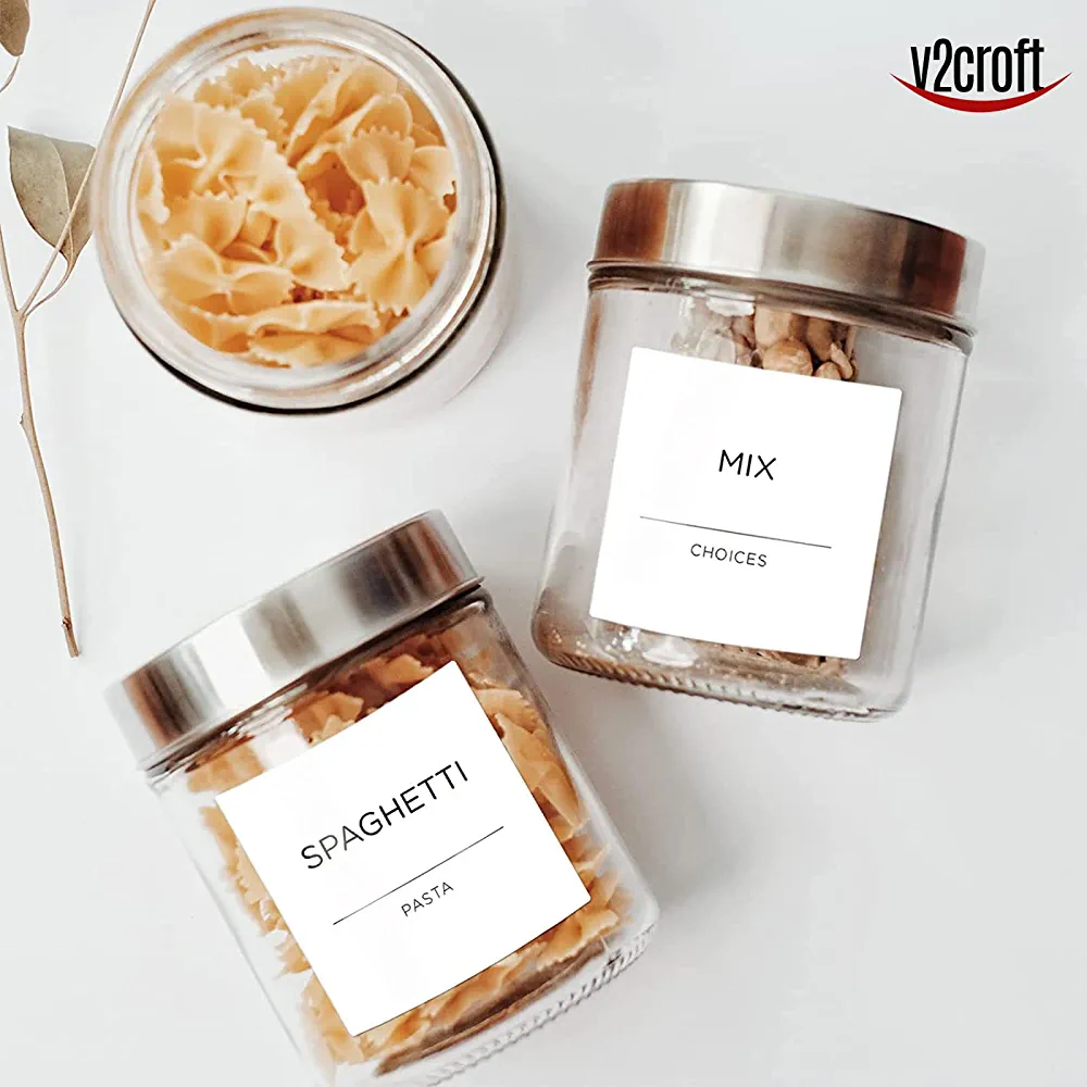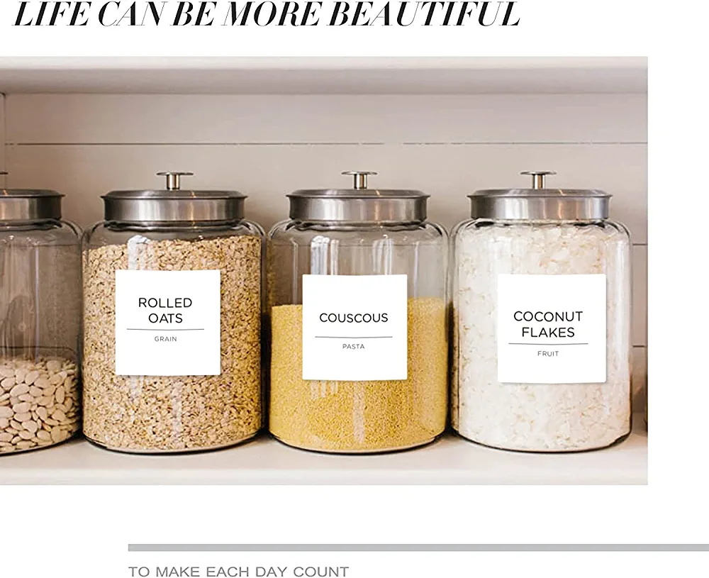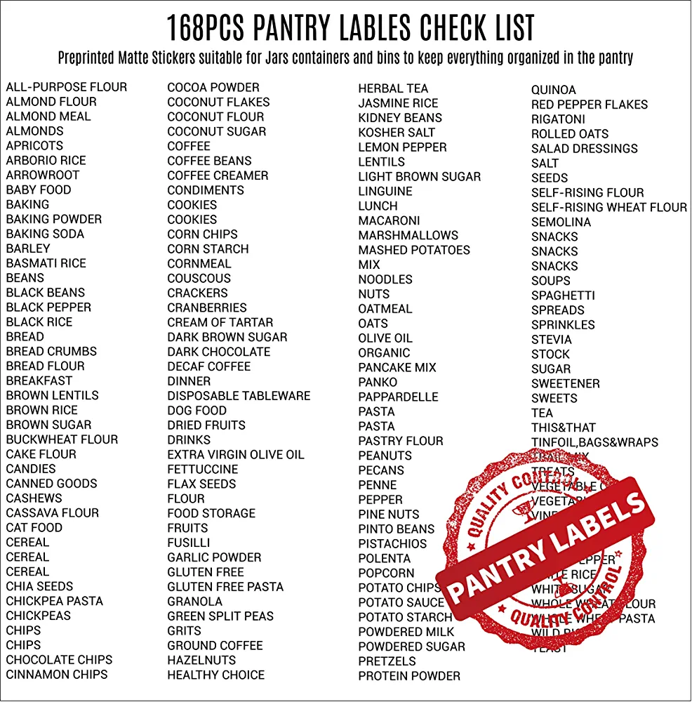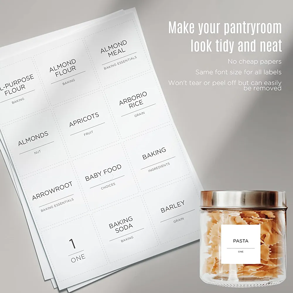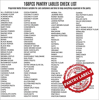 | nameOriginal | v2croft 168 Minimalist Pantry Labels Set for Organization Jars Canisters & Storage Bins, Preprinted Black Text on White Matte Vinyl, Water Resistant Stikers, Pantry Organaztion and Storage(White) |