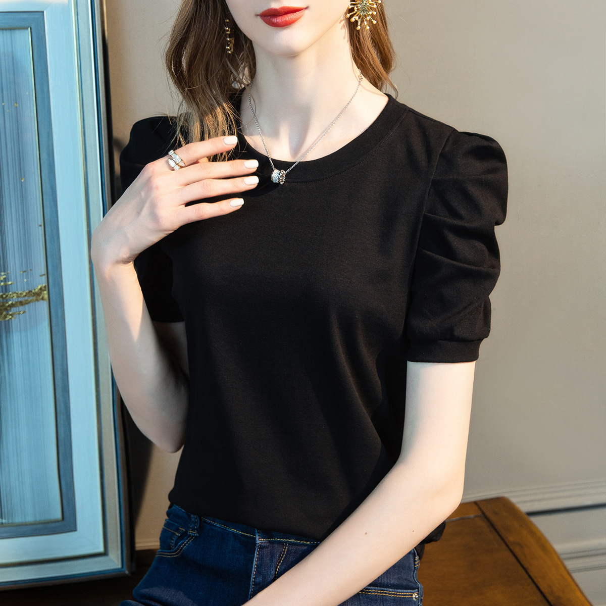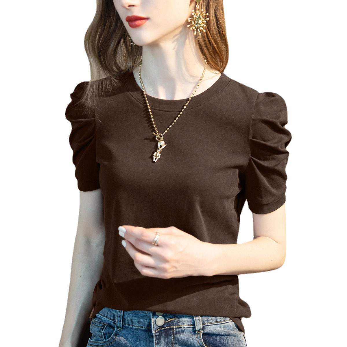 | nameOriginal | 1688 clothes wholesale short sleeve T-shirt women's new solid color half sleeve cotton T-shirt pleated bubble sleeve design top women |