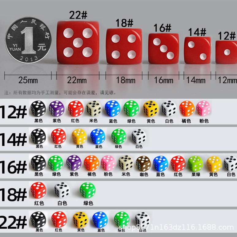 | nameOriginal | 16mm color rounded acrylic dice ktv bar large points chess mahjong sieve Grain Wholesale |