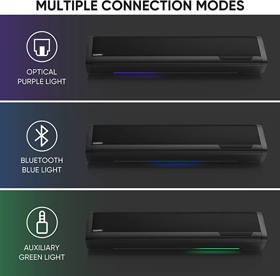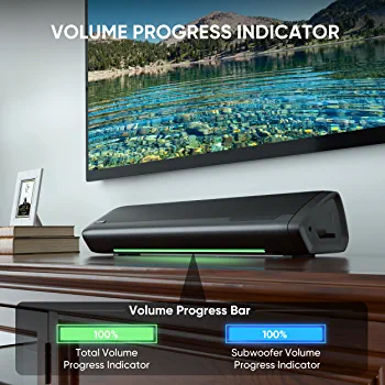 Our sound bar features a multifunctional LED indicator with colored lights that clearly show which connection mode it’s on (Optical-Purple, Bluetooth-Blue, Auxiliary-Green). The volume progress light bar below the soundbar reminds you of the master volume or subwoofer volume in real-time.