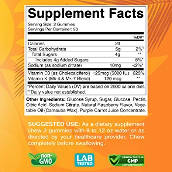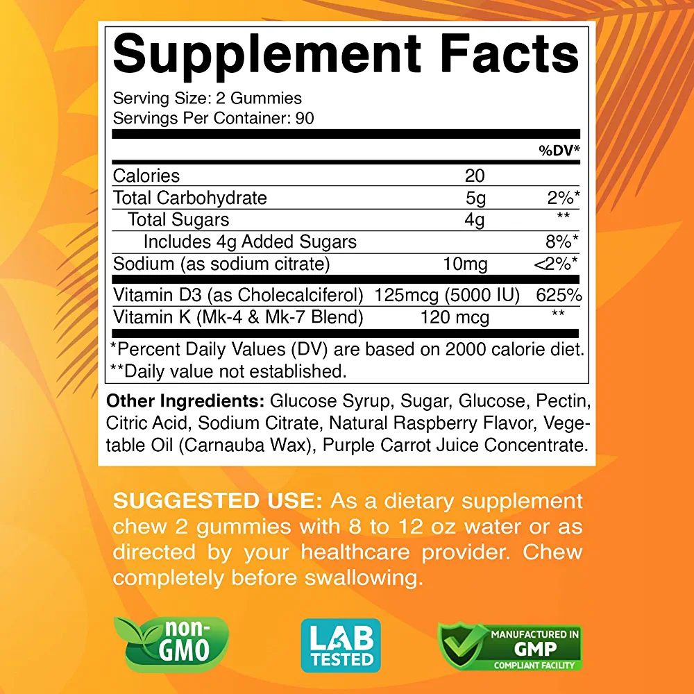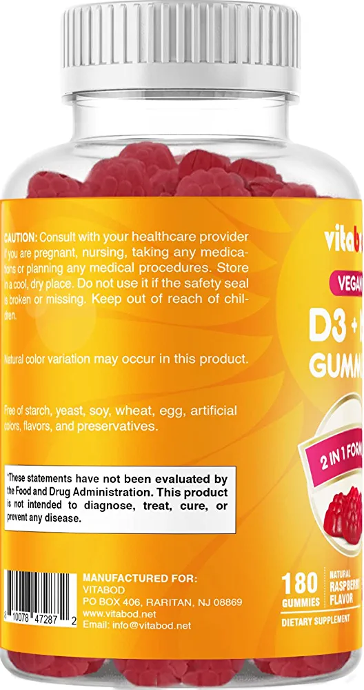 Introducing Vitabod’s Vitamin D3 K2 Gummies, designed to promote bone and heart health. This product comes in a pack of 180 pectin-based gummies.
