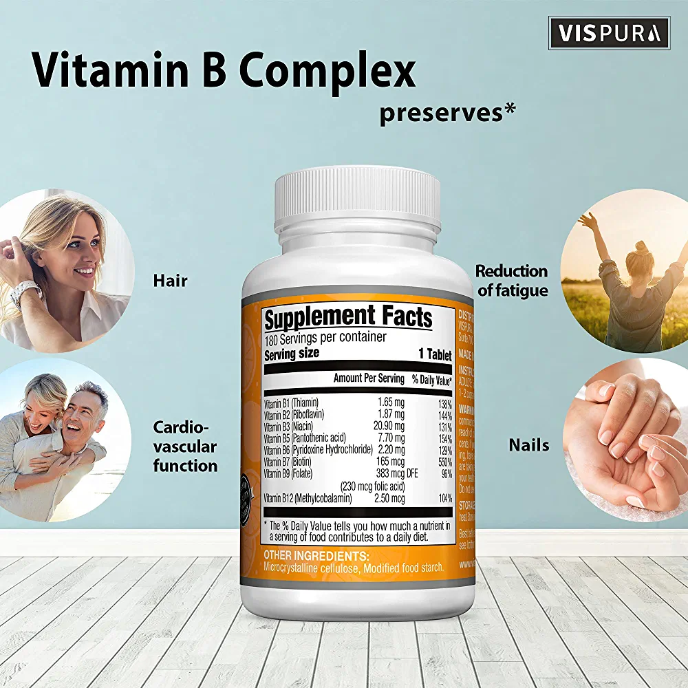 Introducing our Vitamin B-Complex, a natural supplement that contains all essential B vitamins including B12, B1, B2, B3, B5, B6, B7, B9, and Folic Acid. This vegan-friendly supplement comes in a bottle of 180 tablets, providing you with a long-lasting supply of essential vitamins to support your overall health and wellbeing.