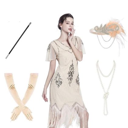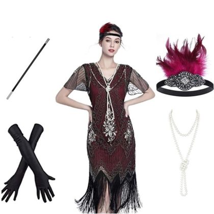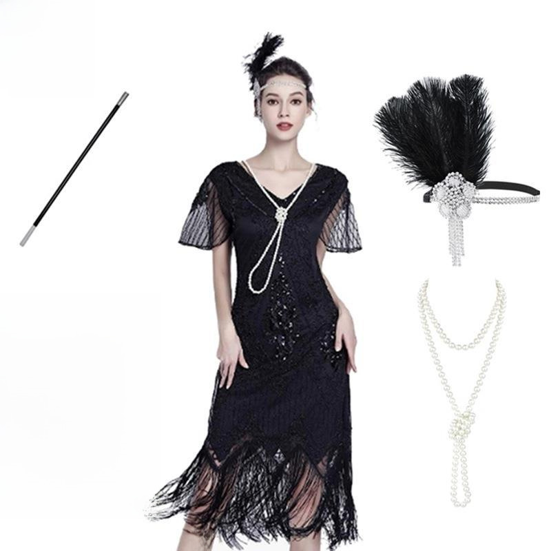 1920s Vintage Gatsby Beaded Tassel Dress Sequin Cocktail Party Evening Dress Set Generational Hair