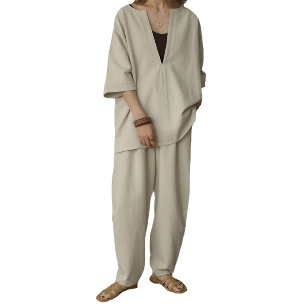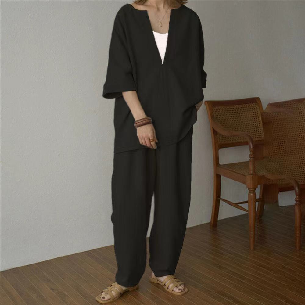 2 Color in stock Solid Color V-neck Two-piece Set 2024 Summer New Japanese Urban Loose Casual Pants suit Women