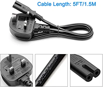 This product is a 5-foot long cable in black color with a Figure 8 C7 interface connector type. It is compatible with various devices such as PS4, PS5, Xbox One Series X/S, HP Printer, Samsung, LG, Toshiba, Philips, Panasonic TV, Sky box, Sky Plus+ HD Box, and more. The cable is made of environmentally friendly PVC material that is flame retardant and heat resistant. It features built-in fuses that ensure home safety during current overload. The wire diameter is 2 X 0.75mm² and is made of oxygen-free refined copper, which has low resistance, good wire performance, and low heat generation. The cable is rated AC 2.5A 250V power cable max 3A and has a standard “C7” interface. It is suitable for HP ENVY, OfficeJet, and OfficeJet Pro printers, Canon Pixma Mark II and Maxify MB2720 printers, Brother QL-570, QL-700, QL-710W, QL-720NW, QL-1050, and QL-1060N label printers, Dymo LabelWriter 450 Turbo Thermal Label Printer, LED LCD Smart TV Monitor Samsung, LG Sharp, Canon Pixma, HP Brother Epson Lexmark, PS2, PS3 Slim, PS4, Dell Sony Asus Gateway Toshiba Laptop, Printer, Scanner, Game Console, Entertainment System, Audio Multiroom Speaker, Music System, Sound Bar, Retro Boombox, Action Keyboard, Digital Piano, Charging Dock, Wireless Backup, Wi-Fi Base Station, Laptop Notebook Charger, and Camera Battery Charger.