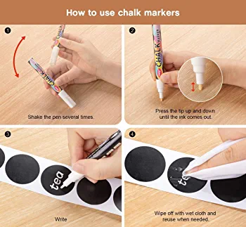 3 EASY STEPS ASSEMBLY: These stickers are ready and super easy to use in these easy steps: Using the liquid marker provided, write on the chalkboard stickers Carefully peel the sticker off the backing paper. Don’t throw the backing just yet, you can replace the stickers if you change your mind. Apply the stickers on any surface: glass, wood, plastic, concrete, porcelain, or metal. A clean dry surface will ensure a better application and removable. Easy to Clean: With a damp cloth or tissue, you can easily erase the chalk off the label. our marker don’t leave any chalk dust or residue on the sticker and it comes out clean as new.—— How to use the liquid markers: These gift chalk markers are made of high-quality materials. They stay damp. For optimum use, please follow these instructions: 1. Shake well with the cap on in an upright position for 20-30 seconds. 2. Take the cap off and hold the tip up-right. 3. Place the marker tip up vertically then press the tip to slightly relieve the pressure. 4. Press the tip on a flat surface repeatedly, until you see the ink come out.