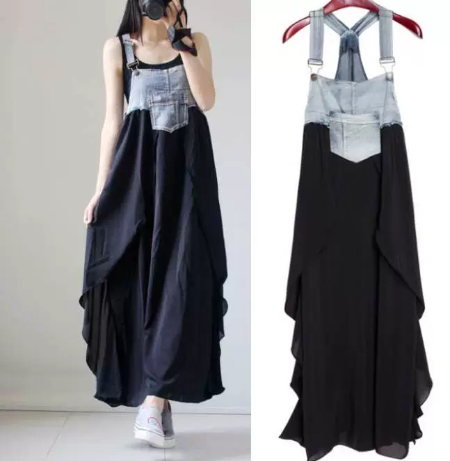 2018 European and American fashion women's summer new denim strap chiffon skirt fashion splicing large size suspender dress