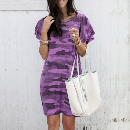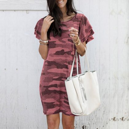 2020 Amazon wish summer new European and American cross-border Women’s round neck camouflage printed short sleeve loose dress
