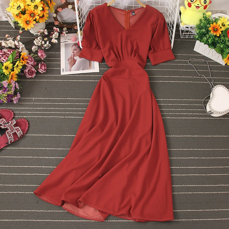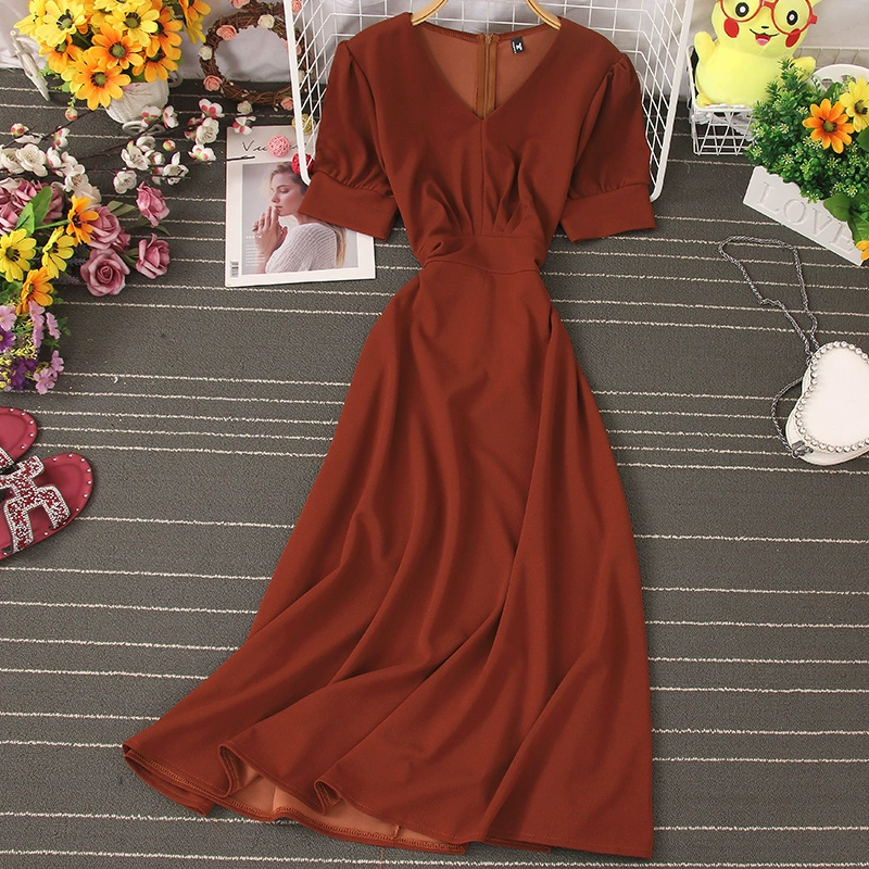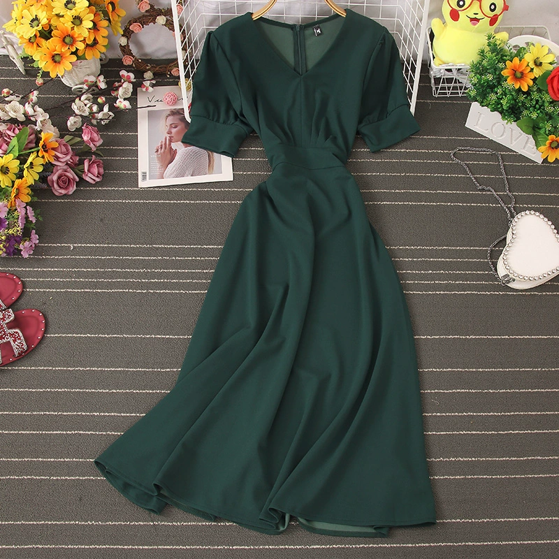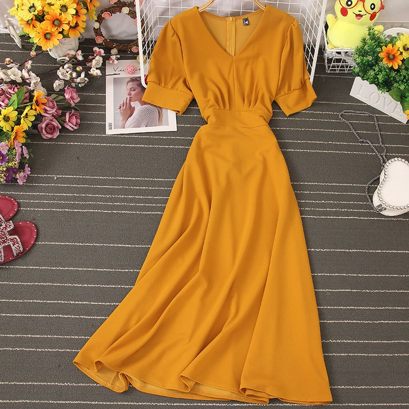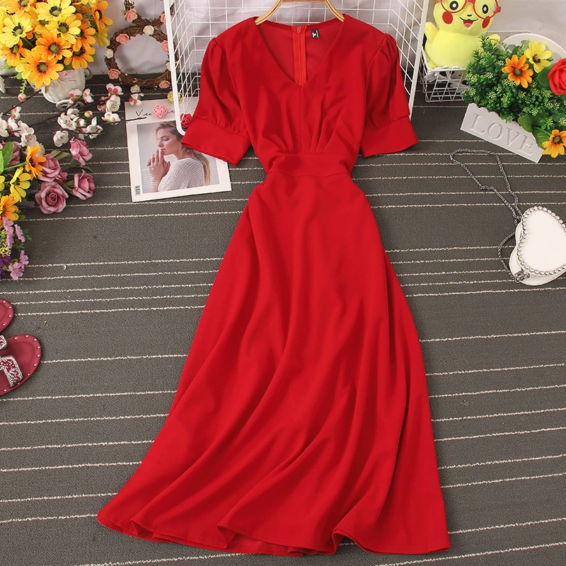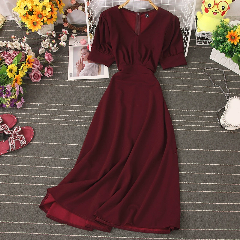2020 French niche platycodon skirt V-neck tie waist dress temperament slim high waist retro wide swing skirt