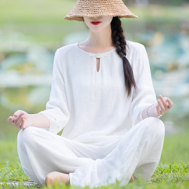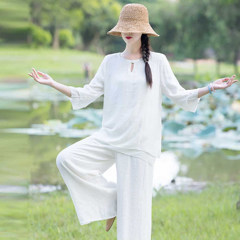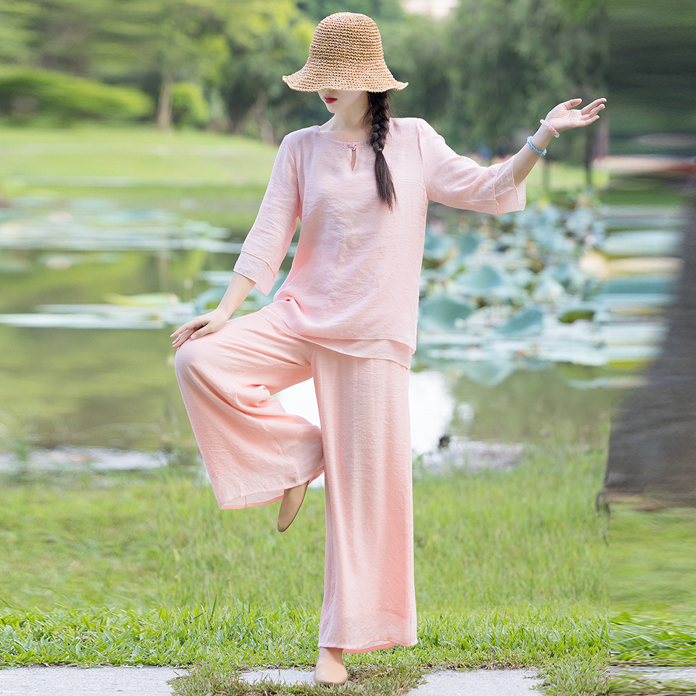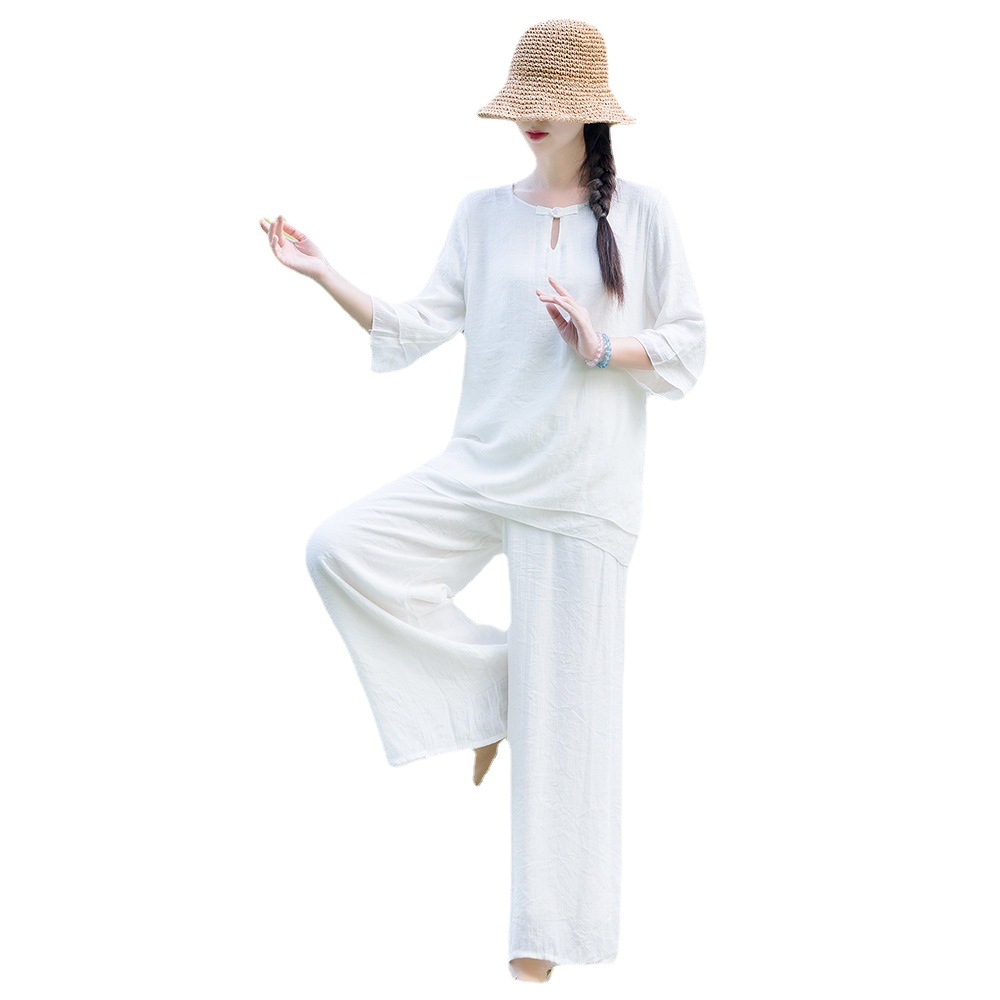 | nameOriginal | 2021 Autumn and Summer New Solid Color Cotton and Linen Yoga Clothing Large Size Loose Wide Leg Pants Zen Tea Clothing Zen Two-Piece Set |