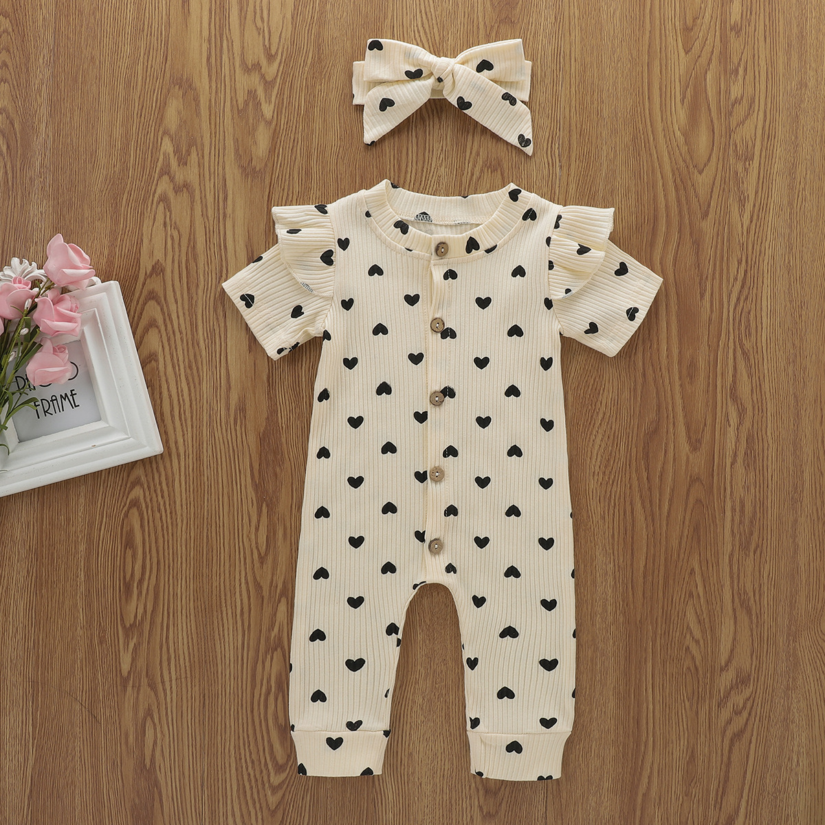 2021 summer new 2-year-old women's baby cotton pit print love Valentine's Day + head knot long climbing jumpsuit