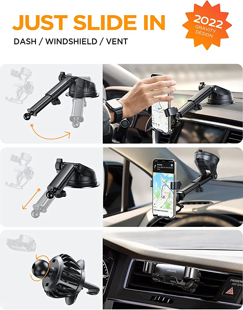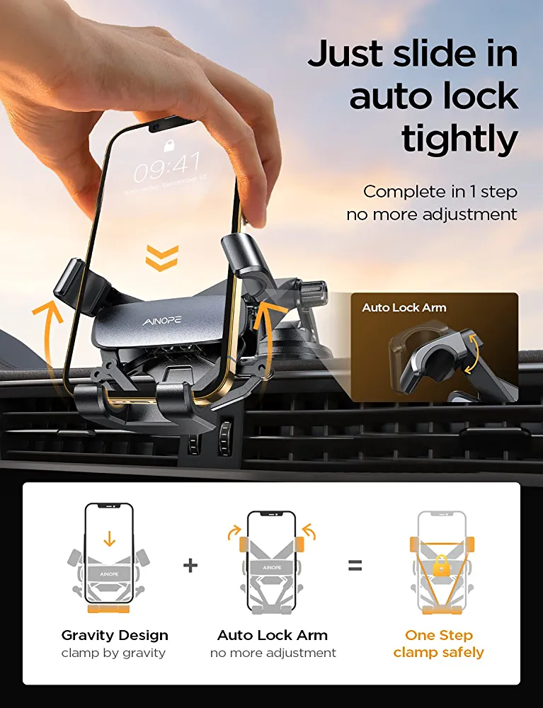 | nameOriginal | AINOPE Phone Mount for Car 2022 Upgrade 3-1 Gravity Car Phone Holder Mount for Car Dashboard Windshield Air Vent Cell Phone Holder Car Mount Compatible with iPhone 14 13 12 11 Pro Max & All Phones |