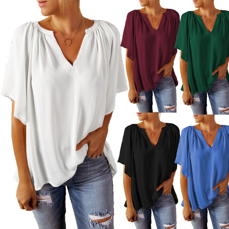 2022 Amazon Summer New Loose Half Sleeve T-shirt European and American Women’s Cross-border V-neck Pullover Top
