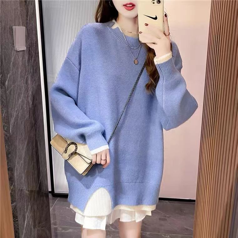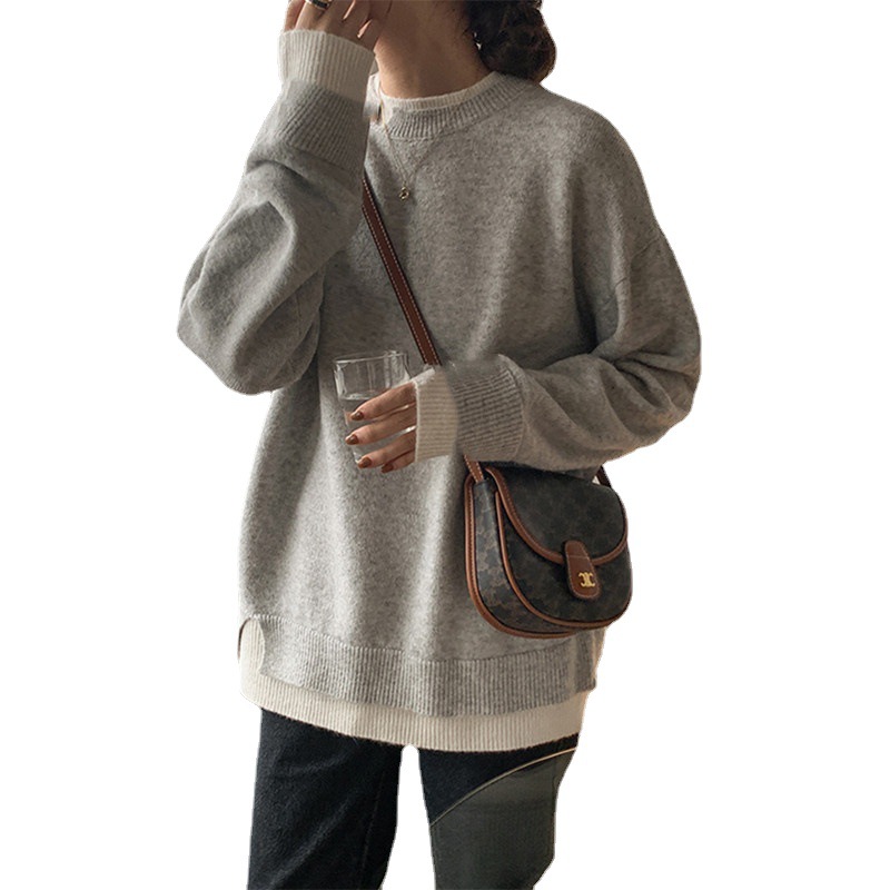 2022 Autumn and Winter New Split Fake Two-piece Pullover Sweater Lazy Style Casual All-match Loose Knitted Pullover Top